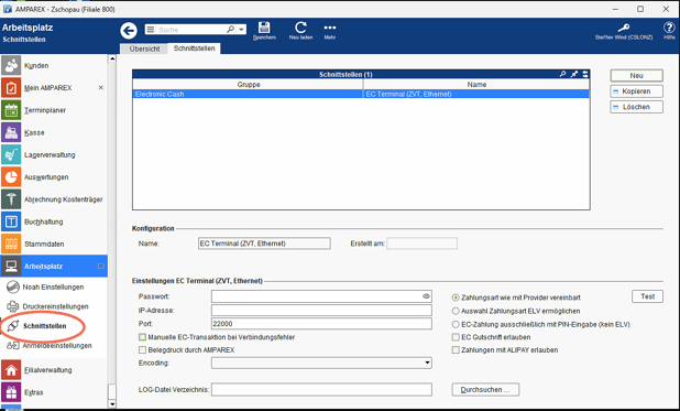 danach oben zum Reiter Schnittstellen wechseln und Electronic Cash auswählen,