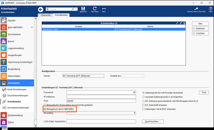Amparex keine EC-Belege auf EC gerät Drucken sondern auf dem Bon Drucker