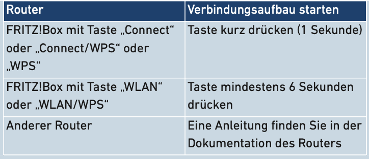 Innerhalb von 2 Minuten: Starten Sie am Router (FRITZ!Box) die WLAN-Verbindung per Tastendruck (WPS). Die Vorgehensweise hängt vom Router ab: