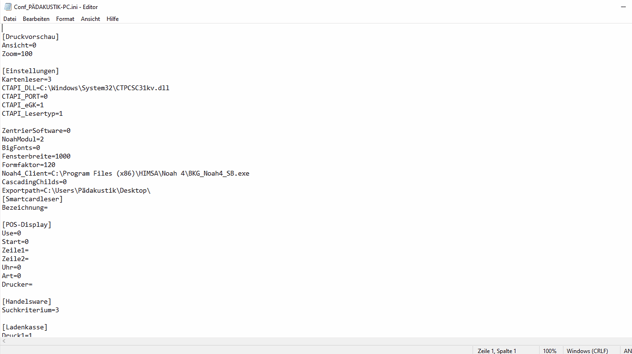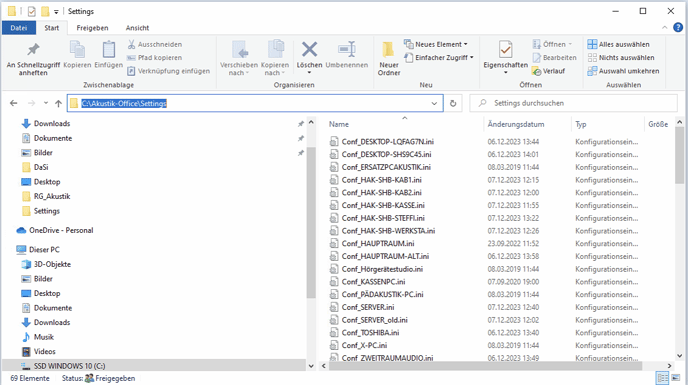 - Jetzt siehst du auf dem Server in dem Ordner "C:\Akustik-Office\Settings" eine config Datei mit dem neuen Namen z.B. "Conf_HAK-SHB-KAB1.ini" öffne die Config datei mit dem alten Namen z.B. "Conf_PÄDAKUSTIK-PC.ini"