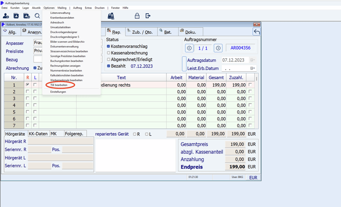 öffne nachdem alle schritte bis hier hin getan hast Akustik Office auf der Kasse und geh zu dem Menüpunkt Optionen -> TSE bearbeiten