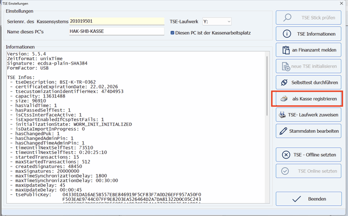öffne den Menüpunkt und klicke hier auf "als Kasse registrieren.
