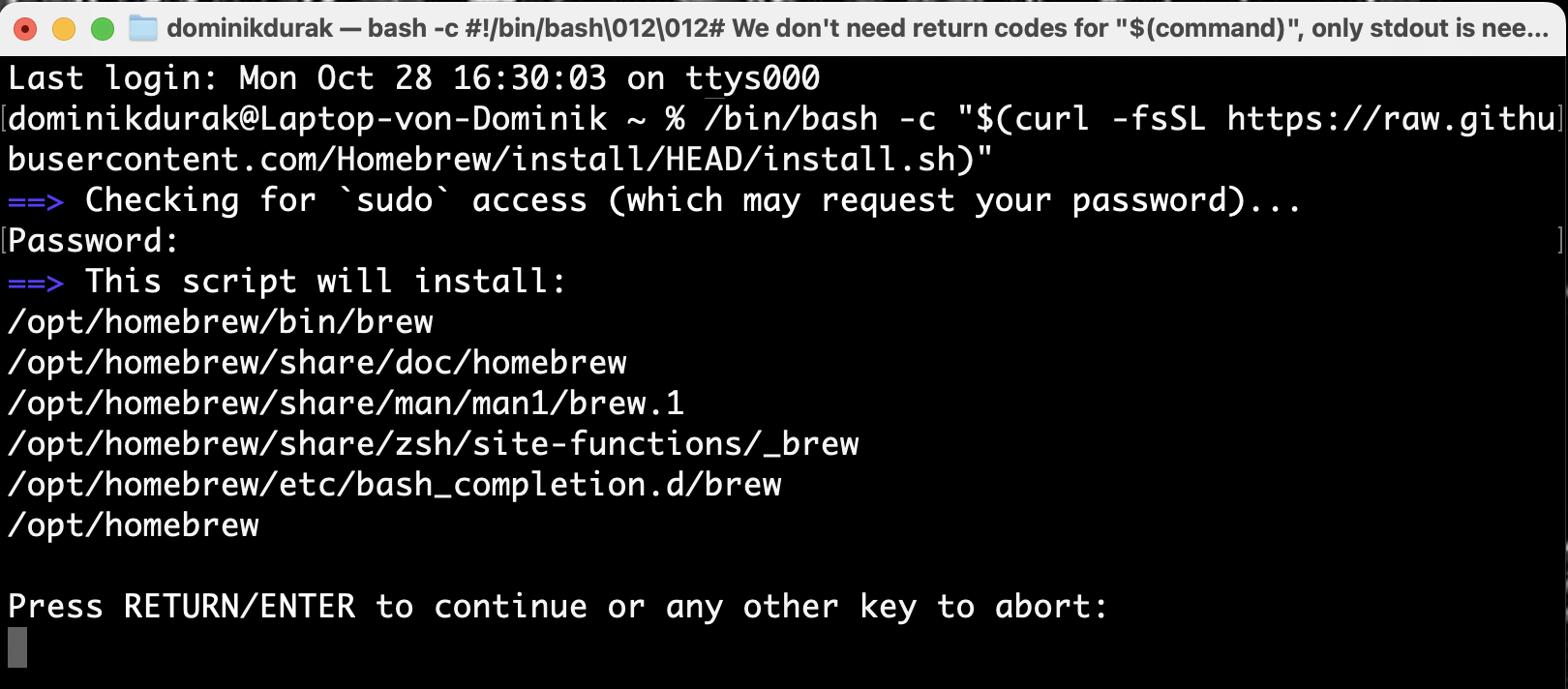 Wir installieren zuerst "brew", dazu kopieren wir uns folgenden Befehl.