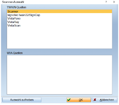 In diesem Fenster haben Sie nun die Möglichkeit entweder einen der installierten TWAIN oder einen WIA-Treiber auszuwählen und der Scannerschaltfläche zuzuweisen.