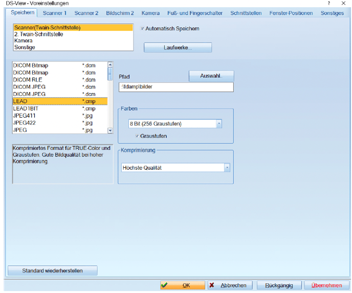 Standardmäßig werden eingescannte Bilder und Dokumente im Format „*.CMP“ gespeichert. Das Format können Sie in den Voreinstellungen des DS-Win-View anpassen. Diese erreichen Sie über das goldene Zahnrad unten Links und dem Reiter „Speichern“.