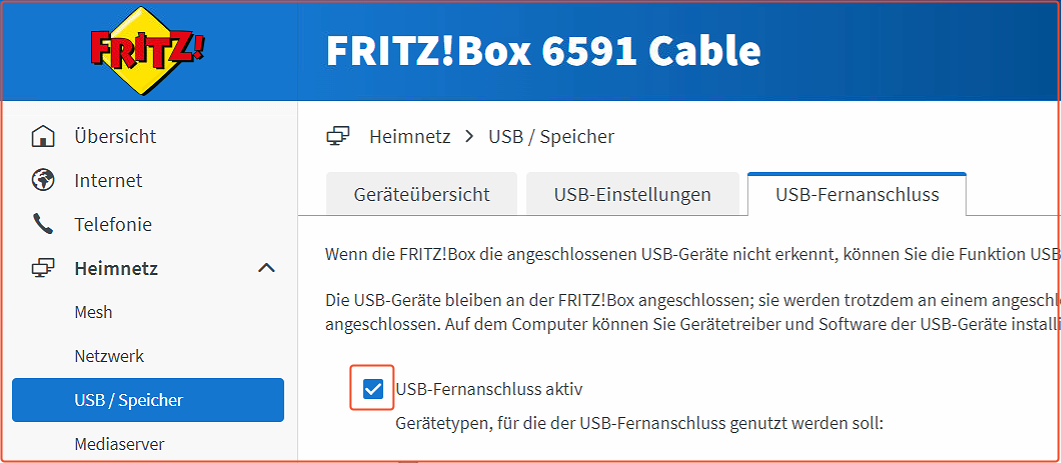 Wir melden uns an der Fritz.Box an und gehe über Heimnetz > USB/ Speicher auf den USB-Fernanschluss, dort überprüfen wir ob der Haken gesetzt ist.