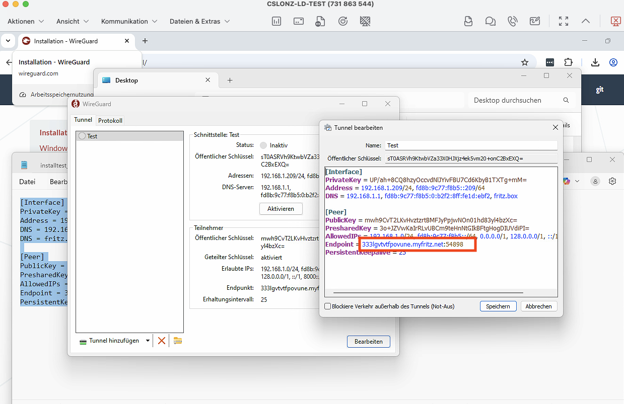 - Kopiere die Adresse des MyFRITZ-Kontos und füge sie in der config datei der Wireguard auf dem Client ein.