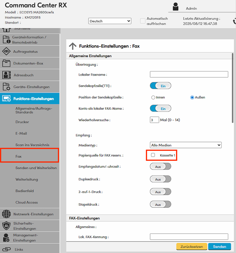 1. Bitte überprüfe zuerst auf der Weboberfläche , ob Papierquelle für FAX reserviert ist. Der Kyocera reserviert und blockiert automatisch diese Kassette. Daher kannst du nicht drucken auf der Kassette 1, auch wenn du es ausgewählt hast.