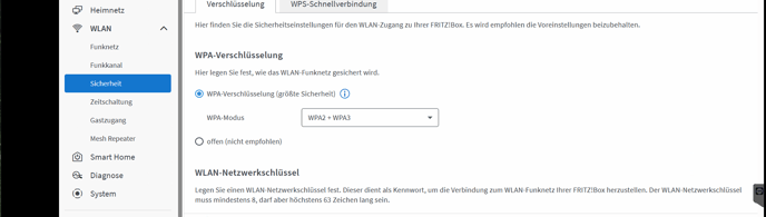 - einloggen in die Fritzbox und WLAN Sicherheit kontrollieren (WPA2+WPA3)