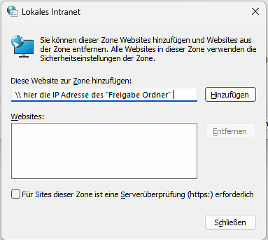 Die Netzwerkquelle als „Lokales Intranet“ definieren.